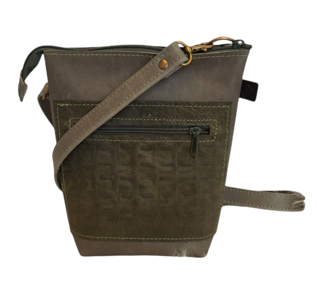 Groene tas met een voorvakje van runderleer met crocoprint.